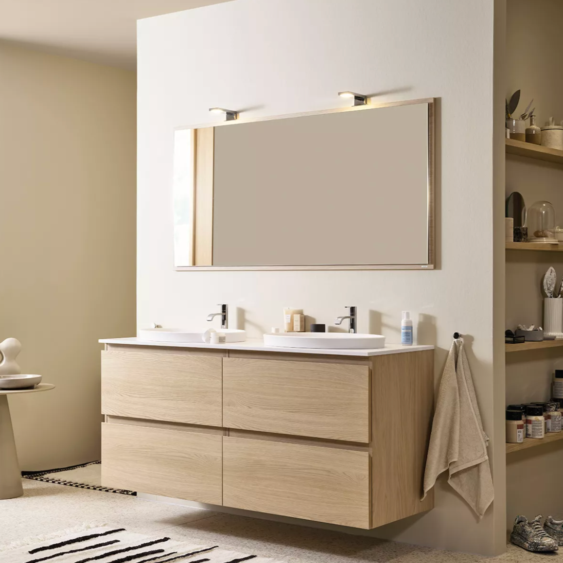 med linnebeige och ljust Terrazzogolv möjliggör serien Flow. Rena linjer i kombination med mjuka former genom den runda spegeln med belysning och det taktila, tunna tvättstället i Top Solid. Underskåpet smälter samman med väggfärgen och ger gott om förvaringsutrymme.