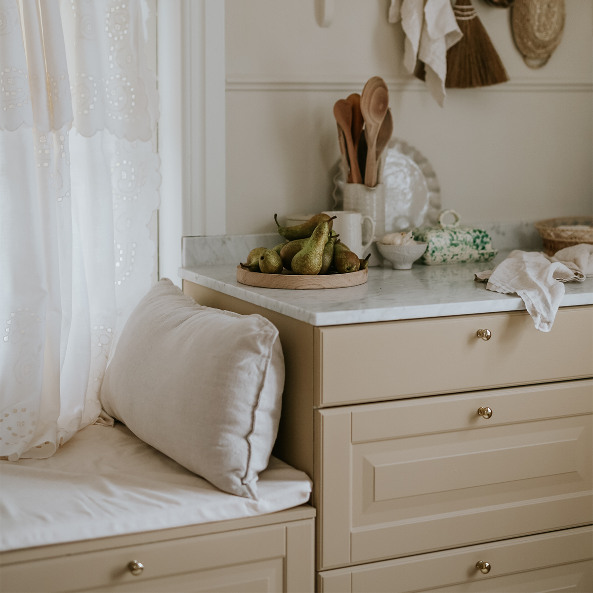Jasmina Bylund drömde om ett kök i fransk lantlig stil. Hon hade en vision om köksluckor målade i en rofylld, gul kulör. Jasmina och Colorama tog visionen i mål och kulören Havregul kom till liv. Det är en lugn och vilsam kulör, snäll mot ögat och föränderlig beroende av ljusinsläpp och placering.
